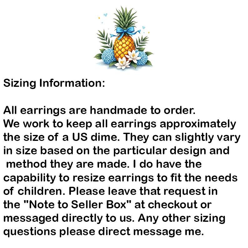 Sizing: We work to keep all earrings approximately the size of a US dime. They can slightly vary in size based on the particular design and method they are made. I do have the capability to resize earrings to fit the needs of toddlers and children. Message us directly for children sizes.